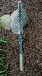 Covering the M4 tapper barrel is an Omega keymod 15″ free floated handguard, then painted smoke gray. The handguards, 2″ O.D., allows plenty of room for the carbine length gas block and a Black Moose 1.5″ x 6.5″ brushed aluminum barrel shroud. I found Black Moose while looking for faux suppressors (no tax stamp) to give the impression of a short-barreled rifle. The cool factor won me over and yes, it’s still loud. A barrel shroud threads flush with the muzzle while covering the barrel behind it and they are very light weight.