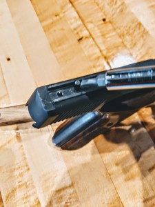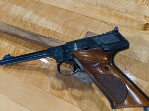 With the new sight base finished and smoothed, I applied a cold blue using http://www.brownells.com Oxpho-Blue #082-024-032WB. I have been using this product for many years and am very happy with the durability and finish. The reflex sight was installed and a range trip was up next to zero in the optic for 25 yards. Adjustments were quick and positive and after zeroing the Woodsman I ran a full clip of .22lr into a shoot-n-see target to present to the Owner with the newly converted pistol. Upon delivery of the pistol I demonstrated the features of the reflex sight and then had the Owner run thru the functions for me. With his arm extended as to sight the pistol he said “no dot does it work” I smiled and told him to very slightly tip the barrel down, as this is common with switching from irons to a reflex sight until you learn new mussel memory. Once visible and the expression on his face, I believe we have another reflex sight convert! As with any project that is somewhat unusual creativity and vision will most likely have you delivering a quality product. This Colt Woodsman pistol now fitted with a modern reflex sight will likely see more enjoyable time in the hands of an old Woodsman with new eyes.