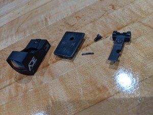 Fitting the new sight base required filing to contour the front bottom portion of the new sight base to fit the slide groove. With both clearance holes drilled, I counter sunk the 6-64 screw for a proper thread depth engagement into the slide and test fit. Careful filing and fitting gave a snug fit of the new sight base into the slide groove. With the base installed, center punch the cross-pin hole location, remove the base and drill a 0.060” clearance hole for the cross pin. Once satisfied with the new sight base fit into the slide groove, a reflex sight needs to be determined as that will position the two 6-48 deck holes. Finding a reflex sight with simple to use functions and one button push for all operations had me calling ADE Optics www.opticsfactory.com and a compact mini Crusader part # rd3-009 was ordered. The sight base deck will be oversize for a mini reflex sight, allowing you to center the optic then marking the holes to be drilled and tapped. Once the 6-48 holes were finished, I shortened the reflex sight mounting screws for a flush fit to the bottom side of the sight base deck. With the reflex sight mounted, I scribed a line around the reflex sight on the base deck to serve as a reference line while filing excess material away.