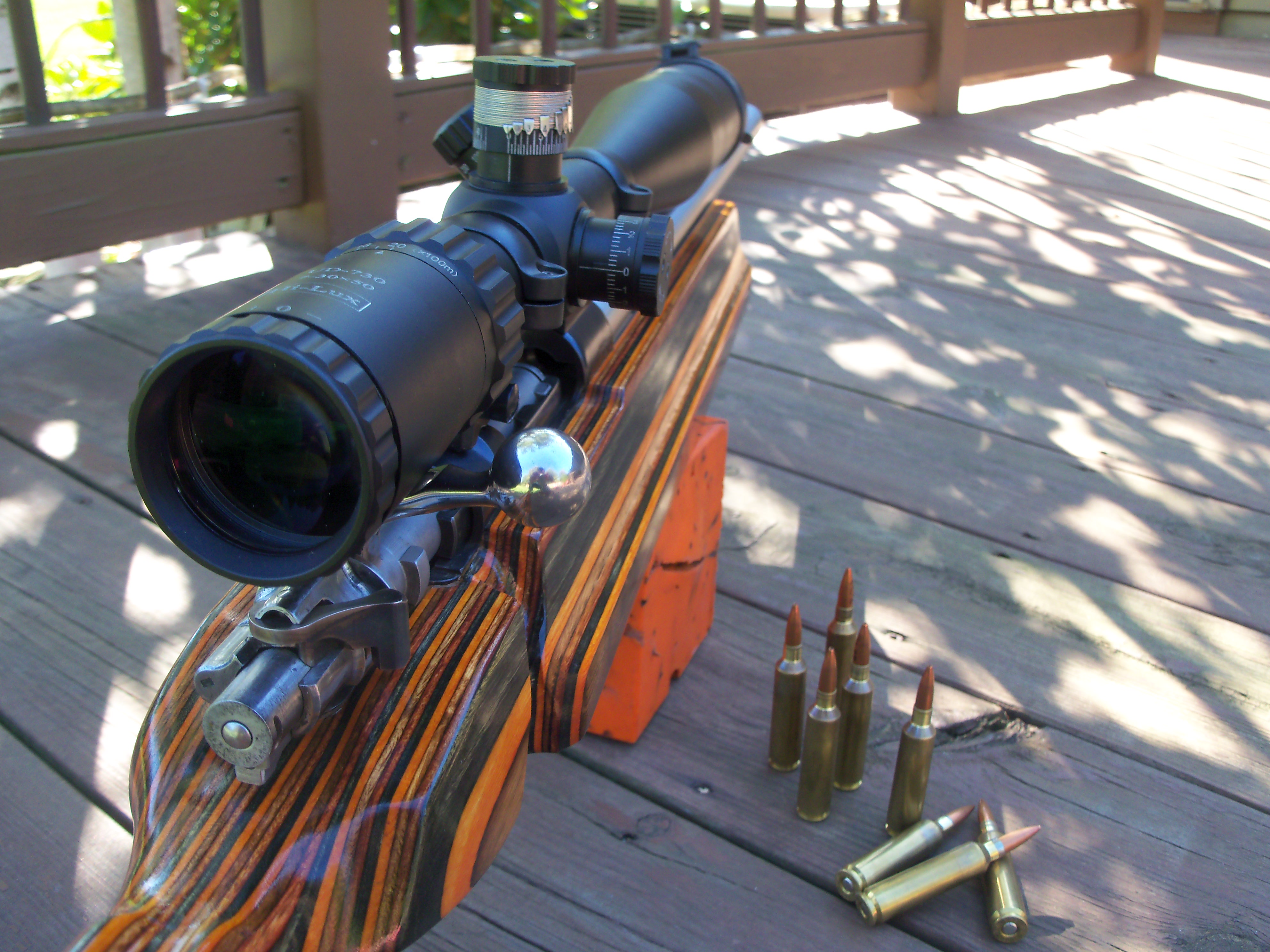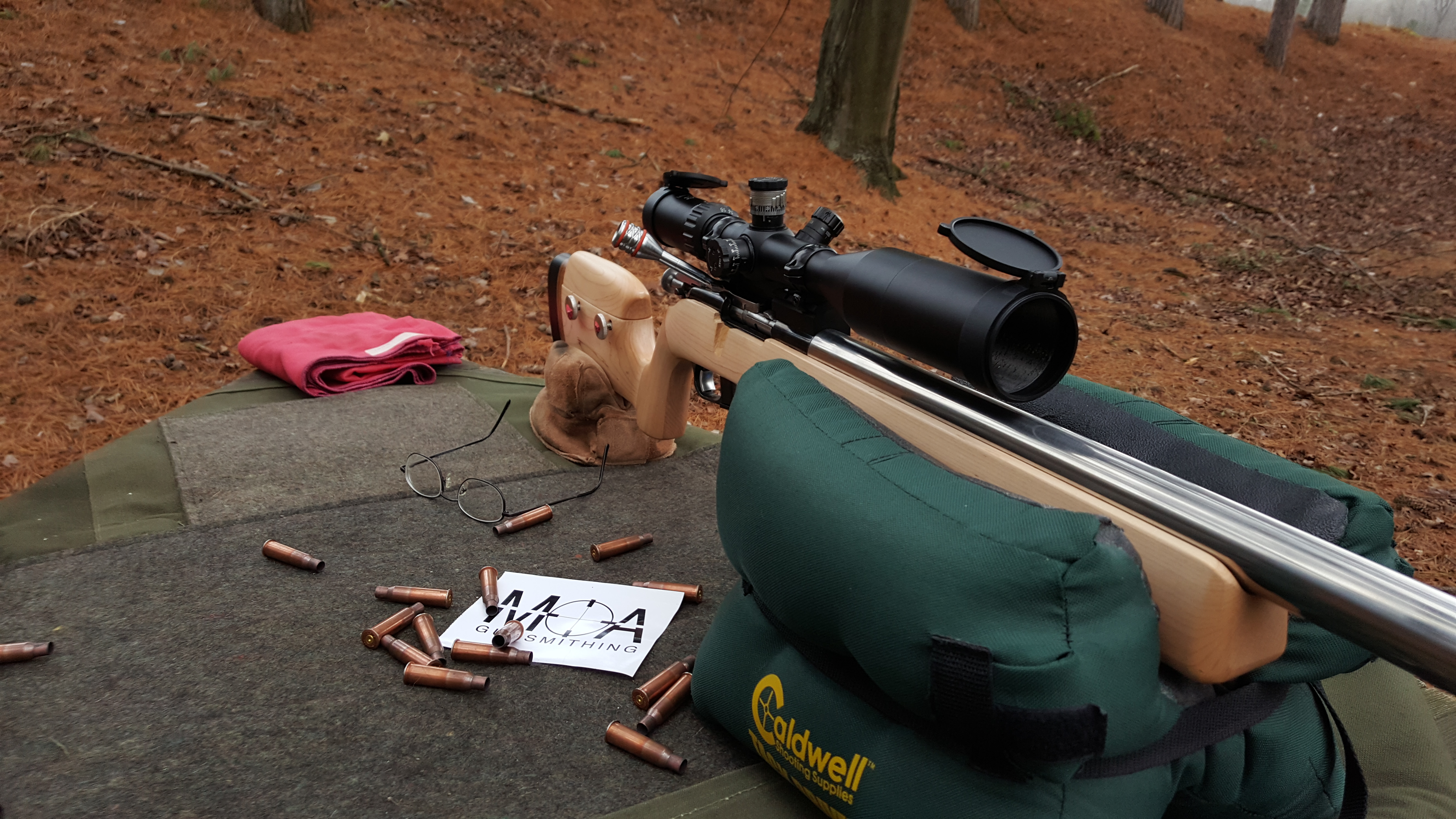 One year ago to the day I posted about the Leatherwood PentaLux optics. Today I am writing about field testing the glass I mounted on a wildcat Mauser chambered in the hot 22-284 Winchester. After a routine scope mounting and bore sighting in the shop it was off to the range for zeroing and  some evaluation. The day was cool, around 37 degrees along with no wind.  I set up the bench bags that would give the rifle a solid rest.  Removing the bolt to compare bore centered on the target with optic center of the reticle proved right on target at 50 yards. 20 fresh rounds loaded up with 75 grain A-Max bullets are charged with H1000 powder, a proven 1/4 moa load.  You see the rifle will be used to test the accuracy of the optics.  Ocular adjustment was easy with a few turns giving way to a crisp clear glass etched reticle.  Then on to dialing in the focus of the target which is made very convenient via a side focus knob. Slipping a round on the benchrest follower allows the bolt to lock up a snug chambering then a light touch to the 6oz Jard trigger ignites the fun. Low and left is where the bullet printed. I adjusted  just a few clicks up and right and had the second shot dead center.  Clicks felt good and positive although seemingly quiet (I couldn’t hear a freight train going thru a nitroglycerin plant ….thanks Clark). Two shots fired and we are ready to go to the 100 yard target.  After dialing in a clear target at 100 yards the focus knob read 100!  That’s factory calibration for ya!