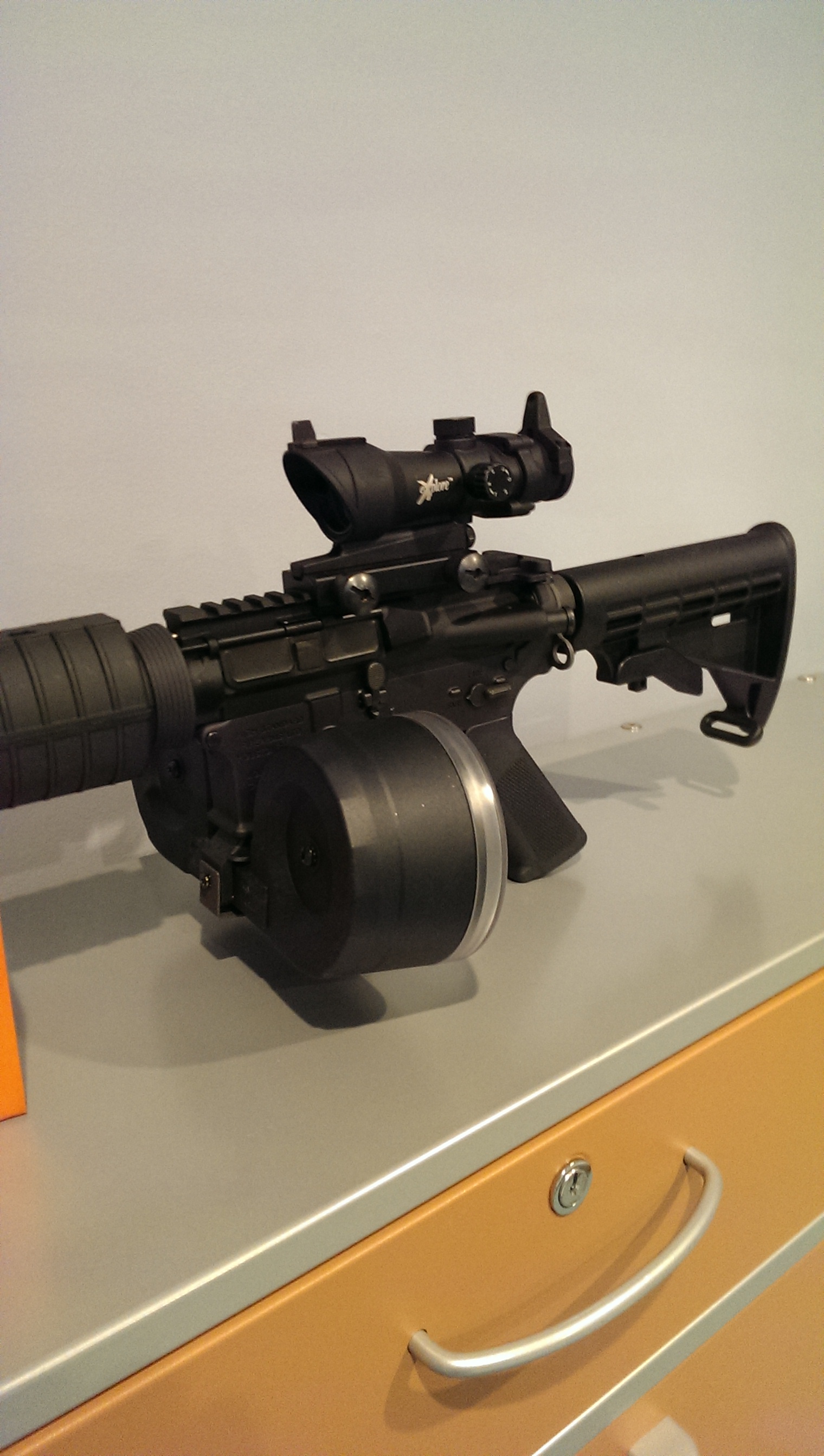 20151130_142103_001 Looking down the business end of a Nagant that loves to digest wolf Ammo 20151130_141949 Another interesting stop was at the Bluegrass Gun Stocks table, this Nagant is resting in a Special Forces Tactical maple stock with a Rock Solid Industries scope mount and yes a Hi-Lux Uni-Dial 4-16×50 optic. Other exciting stops included the Weatherby 6.5×300 Magnum Accumark rifles and how about a 100 round dual drum magazine for your AR15 weatherby-revamps-mark-v IMAG1229 IMAG1227 IMAG1223_1